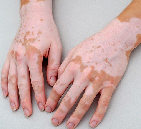 This depigmentation or white patches are more common in areas of the skin which are exposed to the sun. The patches may be on the hands, feet, arms, face, and lips.
